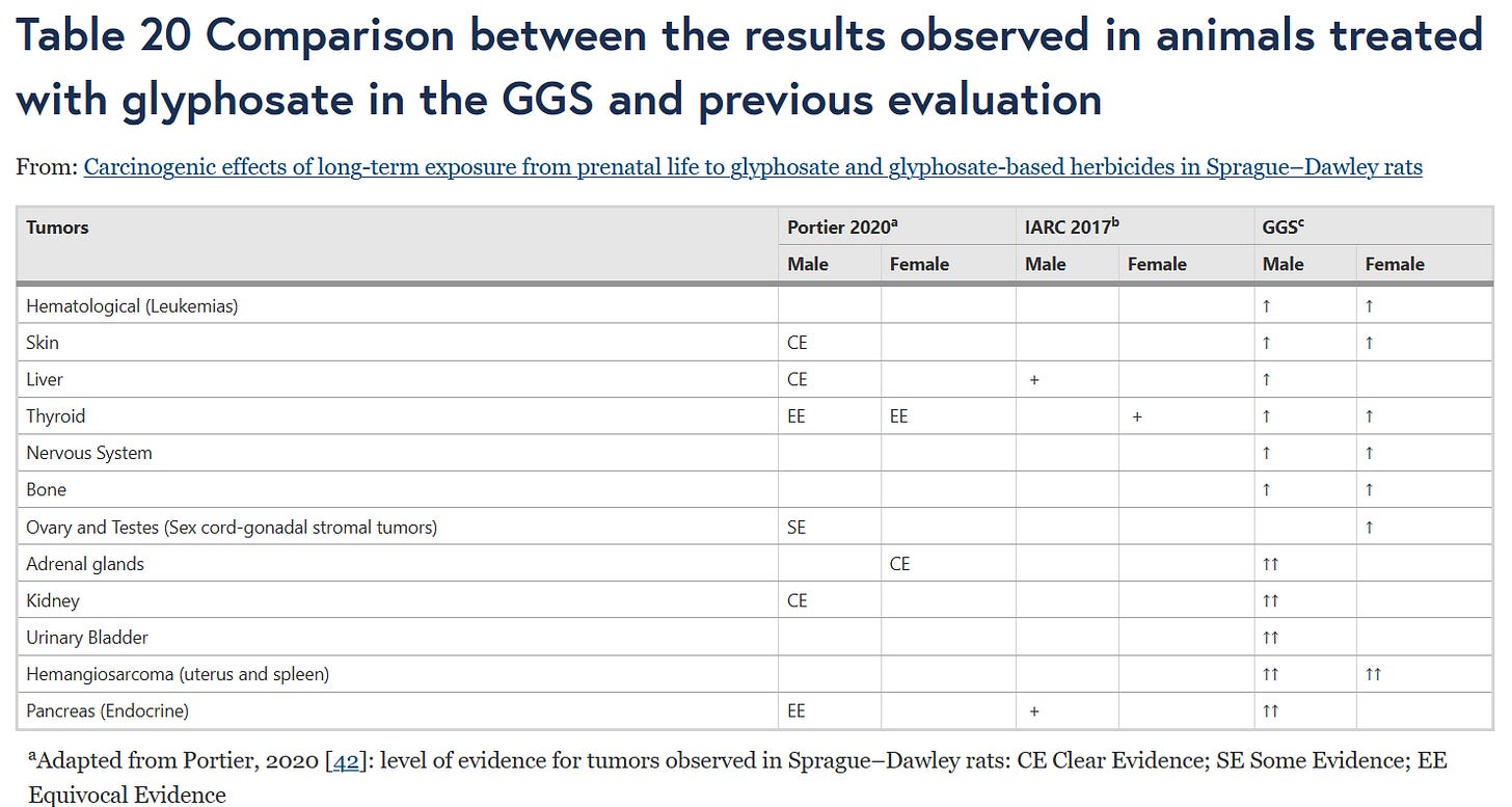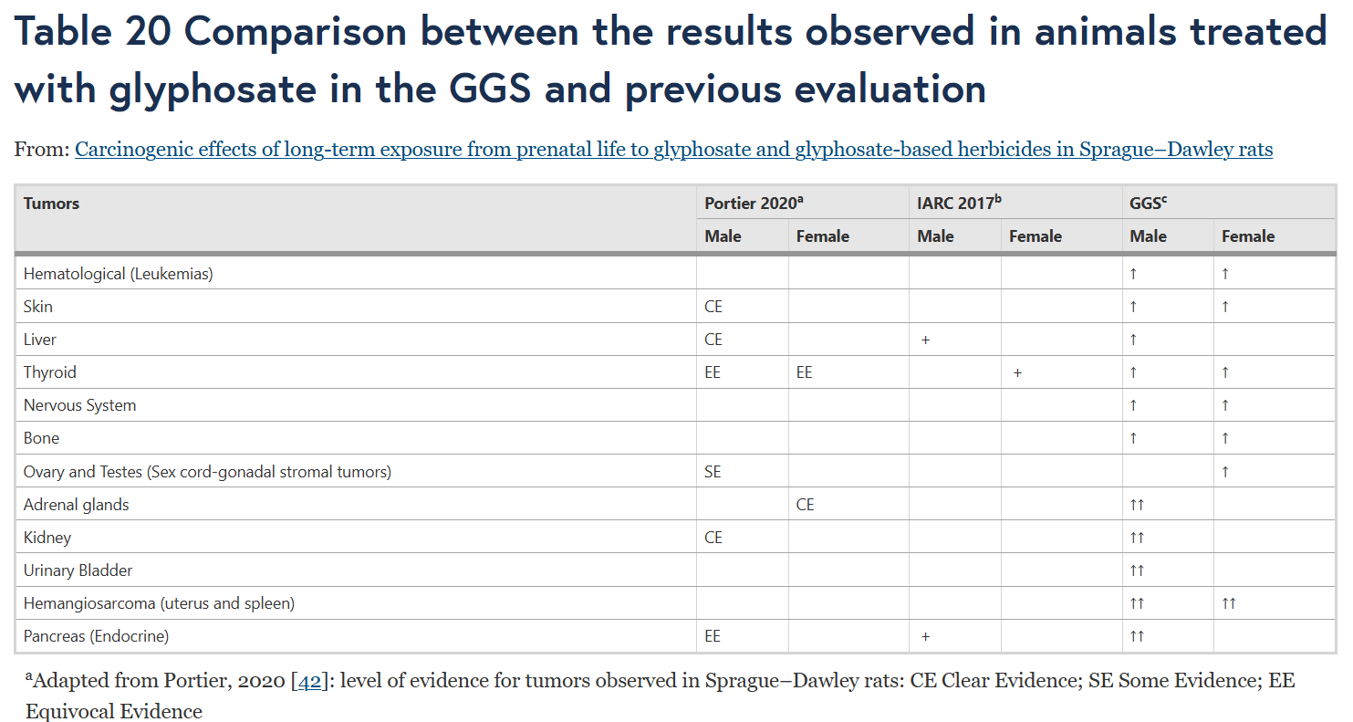 Érdemes megjegyezni, hogy a 112. monográfiában leírtak szerint a Ramazzini-tanulmányban nem volt szignifikáns növekedés a glifozáttal való expozícióval összefüggő bármilyen típusú rosszindulatú daganatok előfordulási gyakoriságában SD patkányokban.